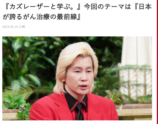 在5月16日,日本電視臺(NTV)熱播欄目“與Kazlaser一起學(xué)”中,節(jié)目組以“日本引以為傲的腫瘤治療最前線”為主題,由日本年輕一代中備受關(guān)注的藝人Kazlaser擔(dān)當(dāng)主持嘉賓,邀請日本信州大學(xué)醫(yī)學(xué)部中沢洋三教授,日本國立癌癥研究中心放療科主任井垣浩、國立癌癥研究中心癌癥基因組信息管理中心河野隆志教授3位專家,一同科普CAR-T(嵌合抗原受體T細(xì)胞免疫療法)、BNCT等腫瘤治療新技術(shù)。
