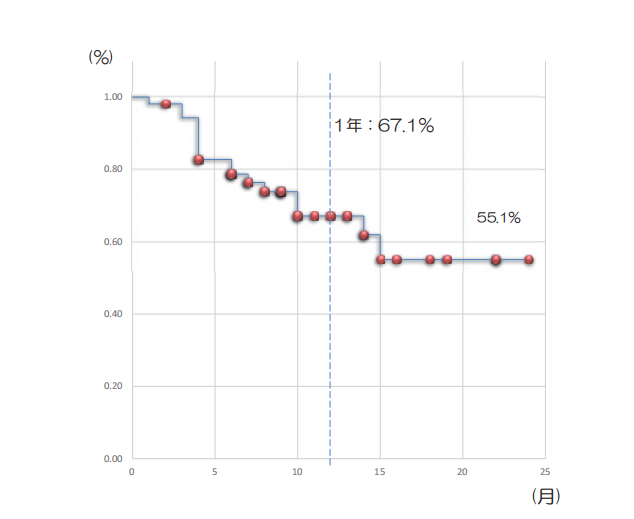 圖2:BNCT治療后患者1年和2年局部無復(fù)發(fā)生存率(本結(jié)果是短期經(jīng)過觀察的患者,再加上COVID-19感染擴(kuò)大時(shí)的書面調(diào)查病例占3成左右,因此有可能與實(shí)際數(shù)據(jù)不同,只是作為參考。)