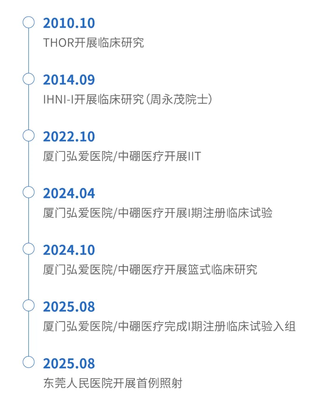 2022年10月中硼醫(yī)療率先在國內開展AB-BNCT應用于腫瘤治療研究以來,攜手廈門弘愛醫(yī)院持續(xù)引領行業(yè)發(fā)展,2024年4月,在有關政府主管部門的積極推動和支持下,啟動了我國首個I期注冊臨床試驗(注冊號:ChiCTR2400082903)。2025年8月,東莞、青島等也相繼宣布啟動I期臨床試驗。